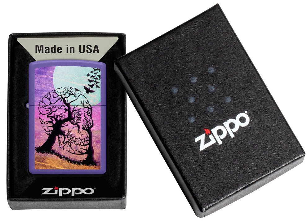 Jato vrana uzdiže se na mjesečini na ovom tamno romantičnom ljubičastom mat upaljaču. Par stabala se miješa u prvom planu dizajna Color Image i formira nasmiješenu lubanju. Dolazi upakirano u poklon kutiji. Za optimalne performanse, napunite Zippo gorivom za upaljače.