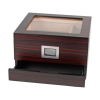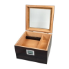 Ovaj humidor očarava svojim jednostavnim dizajnom s furnirom od ebanovine, digitalnim higrometrom, ovlaživačem zraka i razdjelnikom. Možete vidjeti do 40 cigara kroz veliku, prozirnu staklenu ploču. Ovaj komad, napravljen od čistog luksuza, sadrži fioku u koju možete odložiti svoje dodatke za cigare, kako biste odmah započeli svoje uživanje u cigari.