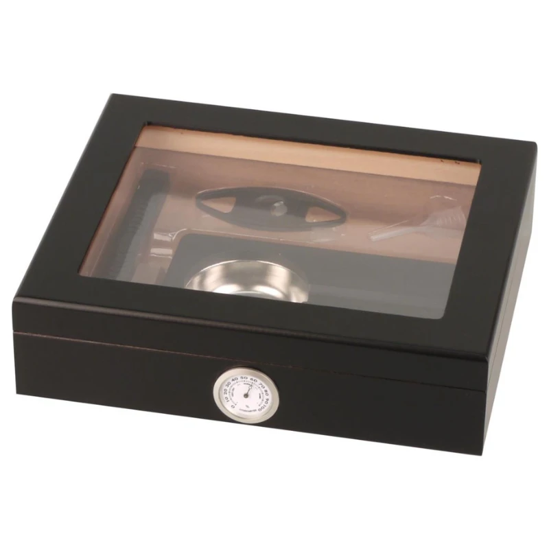 Ovaj set garantuje savršen početak u svijetu užitka pušenja. Humidor sa staklenom pločom pun je gotovo svega što vam je potrebno za uživanje u cigarama. Rezač obezbeđuje sve što je potrebno, a pepeljara nije samo za sakupljanje pepela jer ima i odmorište za Vašu cigaru. Crna kutija za cigare je također uključena u ovaj set.