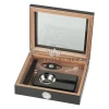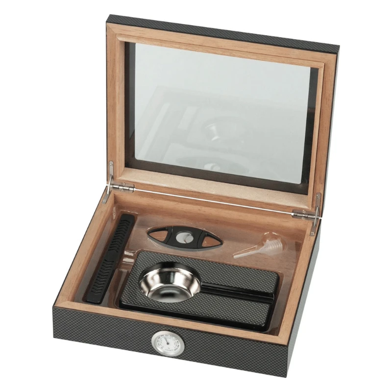 Ovaj set garantuje savršen početak u svijetu užitka pušenja. Humidor sa staklenom pločom u karbon crnoj nijasni, pun je gotovo svega što vam je potrebno za uživanje u cigarama. Rezač obezbeđuje sve što je potrebno, a pepeljara nije samo za sakupljanje pepela jer ima i odmorište za Vašu cigaru. Crna kutija za cigare je također uključena u ovaj set.