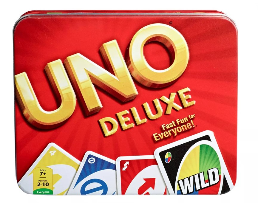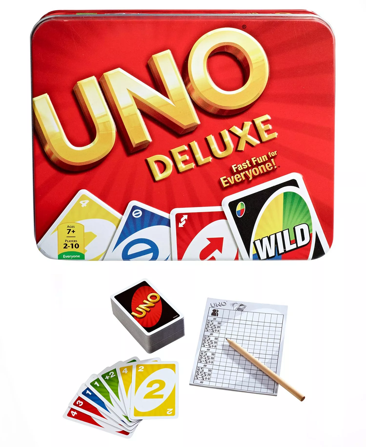 Igre se često pokvare onog trenutka kada domaćin shvati da nedostaje jedan komad igre. S Uno Deluxe verzijom to više nije problem! Ova popularna kartaška igra sada dolazi u novo dizajniranoj limenoj kutiji koja čuva sve karte na jednom mjestu i uvijek ih drži nadohvat ruke.