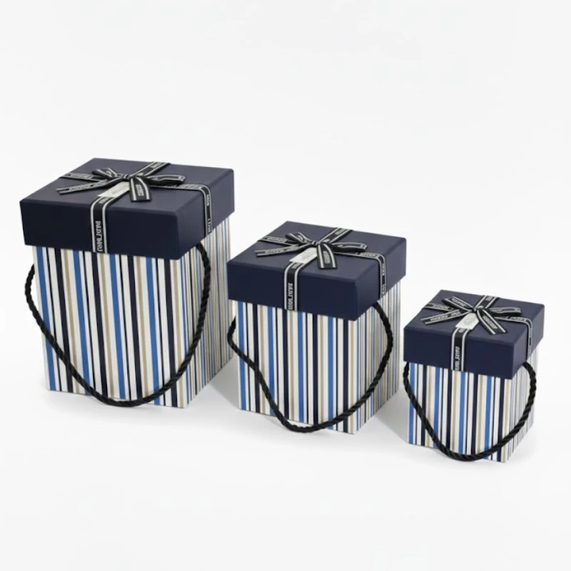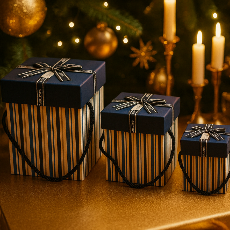 Ova manja darovna kutija izrađena je u istom elegantnom stilu kao i veći model, s tamnim poklopcem, dekorativnom mašnom Best Wishes i prepoznatljivim prugama u plavim, zlatnim, crnim i bijelim tonovima. Zahvaljujući čvrstoj konstrukciji i praktičnoj bočnoj ručki, idealna je za sitnije poklone poput nakita, kozmetike, suvenira ili manjih dekoracija.