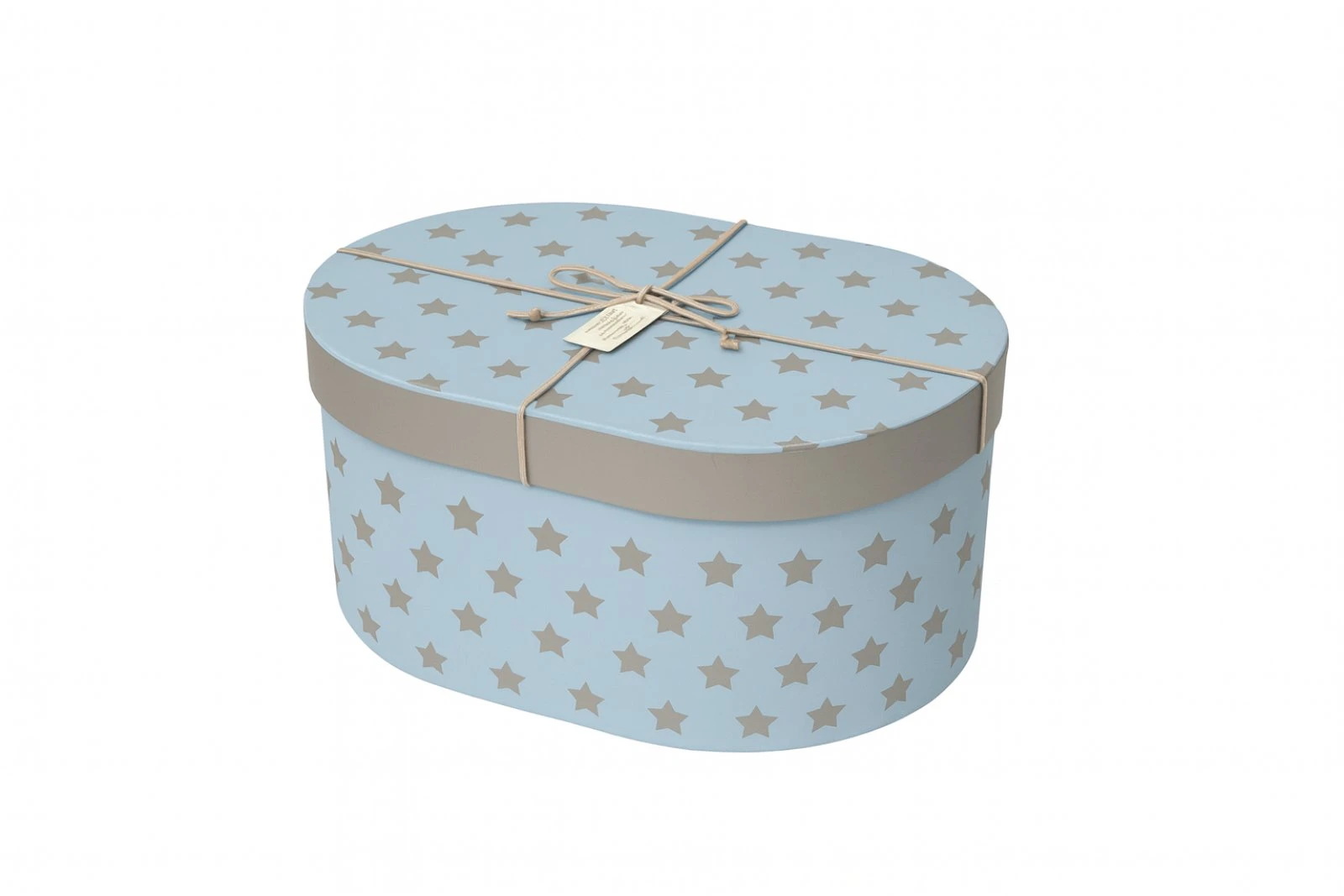 Ova nježna i elegantna poklon kutija savršen je izbor za moderno i profinjeno pakovanje poklona. Izrađena u nježnoj puder-plavoj boji, ukrašena diskretnim sivim zvjezdicama i upotpunjena minimalističkom sivom trakom s karticom, ova kutija ostavlja utisak topline, pažnje i ekskluzivnosti.