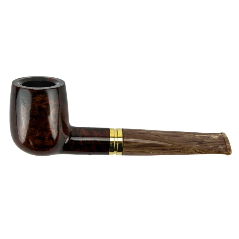 Svijetli akrilni usnik pruža lijep kontrast toplom, crvenosmeđem tijelu lule. Diskretna udubljenja u zlatnom prstenu dodaju moderni naglasak i ističu elegantan stil lule.