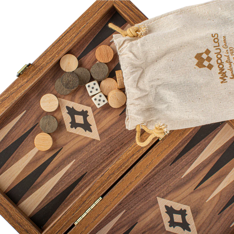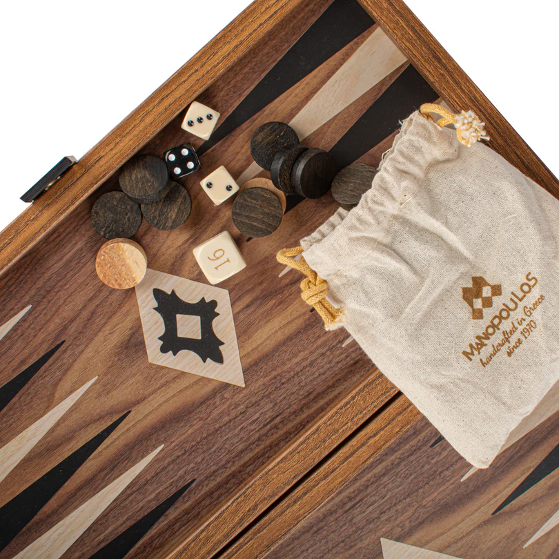 Backgammon set u boji oraha posjeduje štampanu (ne uloženu) površinu za igru koja prikazuje efektan drveni dezen. Kontrastne crne i hrastove tačke daju upečatljiv vizualni efekat, poboljšavajući i izgled i funkcionalnost table.