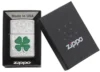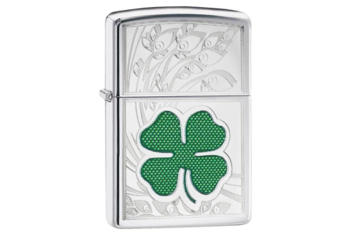 Ovaj upaljač od visoko poliranog kroma krasi prekrasan graavirani dizajn i slika djeteline s četiri lista.