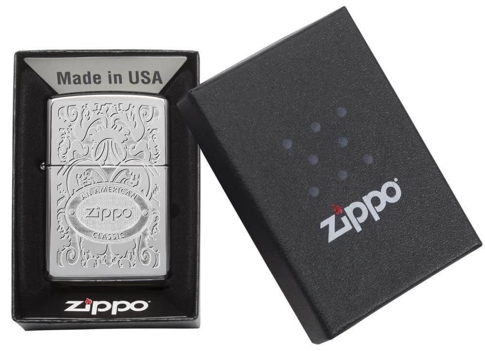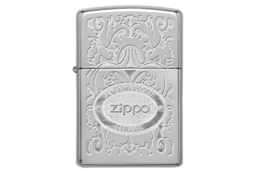 Ovaj visoko polirani kromirani upaljač je ukrašen elegantnim filigramskim uzorkom i ima utisnut Zippo logo.