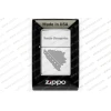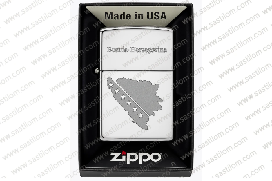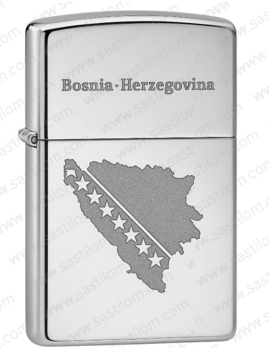 Ovaj elegantni Zippo upaljač izrađen je od visoko poliranog kroma i ukrašen detaljno ugraviranom mapom Bosne i Hercegovine sa karakterističnom trakom i zvjezdicama. Gravura je izvedena u finom, mat reljefu koji se savršeno ističe na sjajnoj chrome podlozi, dajući upaljaču luksuzan i prepoznatljiv izgled.
