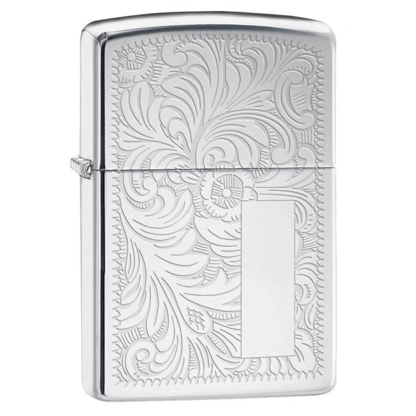 Ovaj visokopolirani hromirani venecijanski® upaljač ima dekorativne ukrase sa obje strane.