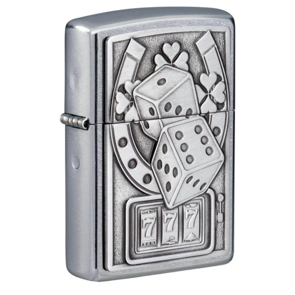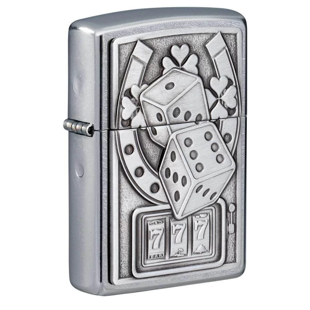 Pripremite se za dobijanje jackpota s ovim dizajnom Lucky 7! Ovaj Street Chrome ™ upaljač prikazuje amblem na temu kockica, djeteline i sretne potkove na temu kasina.