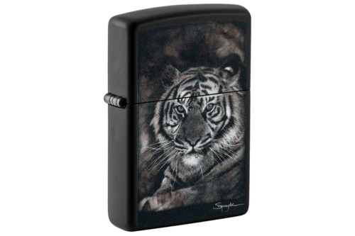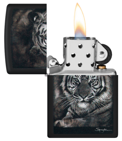 Poznat širom svijeta kao Slikar Vatre, Steven Spazuk koristi tehniku poznatu kao fumage kako bi prikazao zapanjujuće i majstorski složene scene koristeći samo plamen upaljača. Spazukov dizajn Tigra pojavljuje se na ovom crnom mat upaljaču korištenjem našeg procesa Color Image. Dolazi upakovan u poklon kutiji. Za optimalne performanse, napunite Zippo gorivom za upaljače.