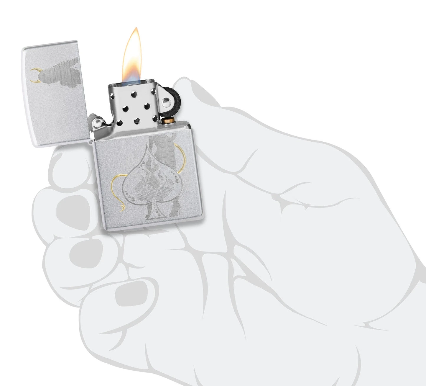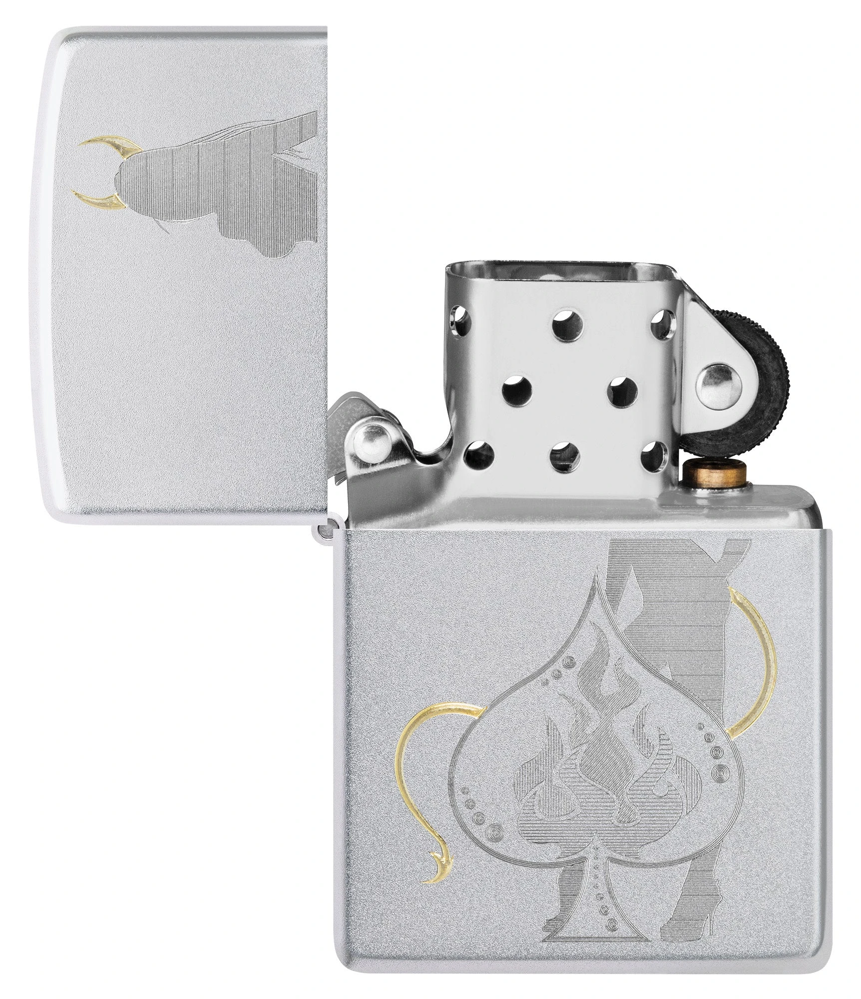 Zavodljiva demonska figura proviruje iza sretne pik karte na ovom razigranom Satin Chrome Zippo upaljaču. Luksuzni mesingani tonovi i detaljan, slojeviti dizajn postignuti su naprednim Auto Two-Tone procesom, što ovom modelu daje poseban karakter i vizualnu dubinu.
