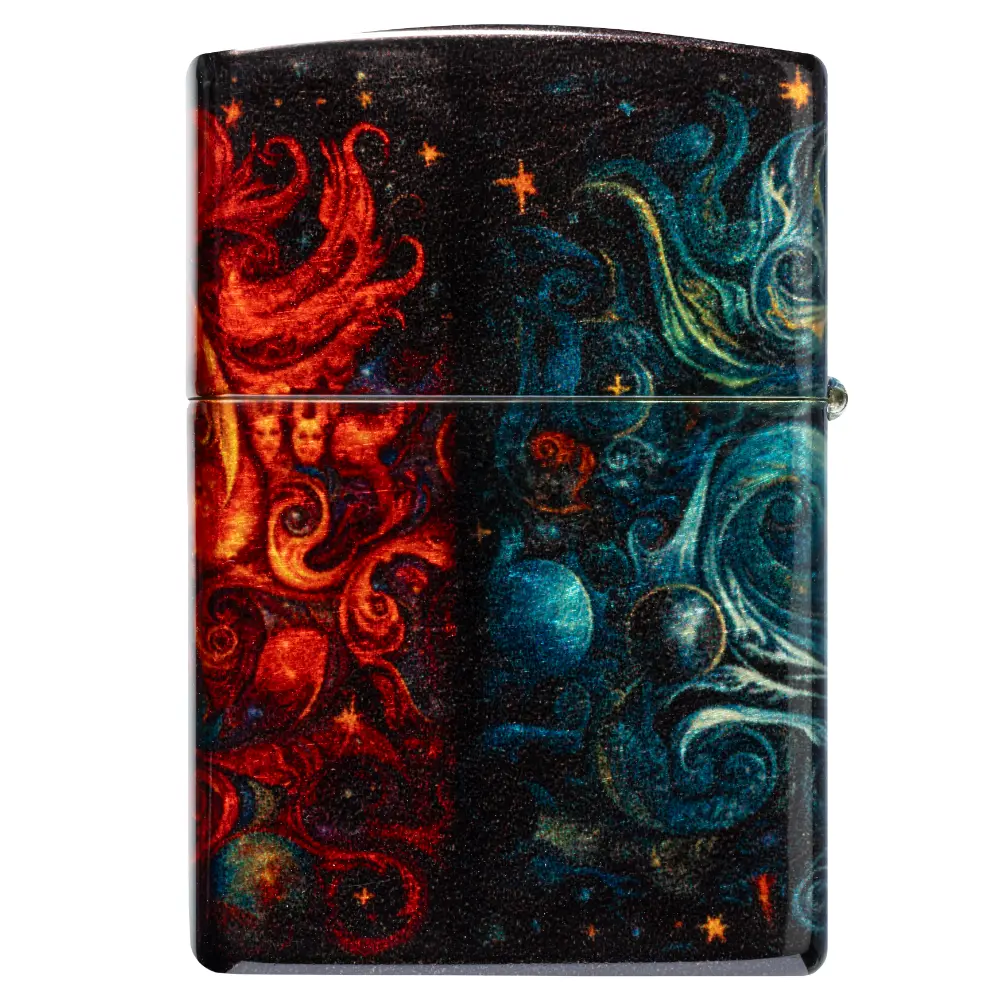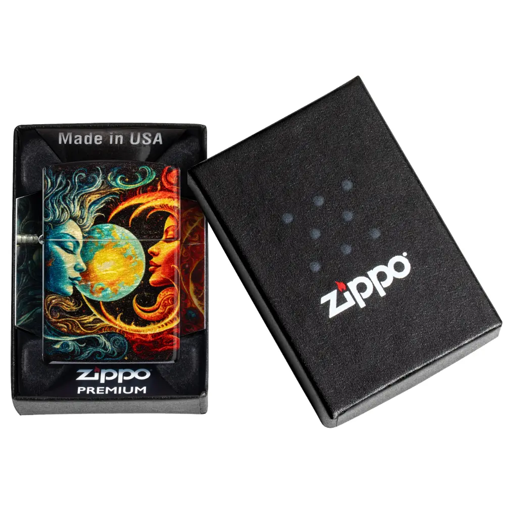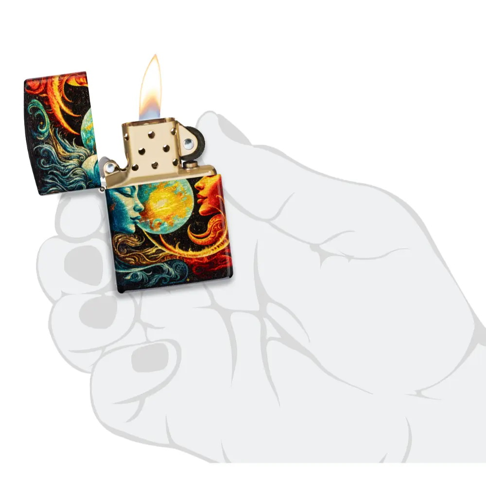 Mistični motiv Sunca i Mjeseca prikazan je u prekrasnom, duhovno inspirisanom dizajnu koji simbolizira ravnotežu, energiju i cikluse prirode. Ovaj upečatljivi Spiritual Sun and Moon prikaz obavija cijeli upaljač zahvaljujući sofisticiranoj 540 Fusion tehnologiji — tehnici koja omogućava potpuno, živopisno omotavanje dizajna oko tijela upaljača.